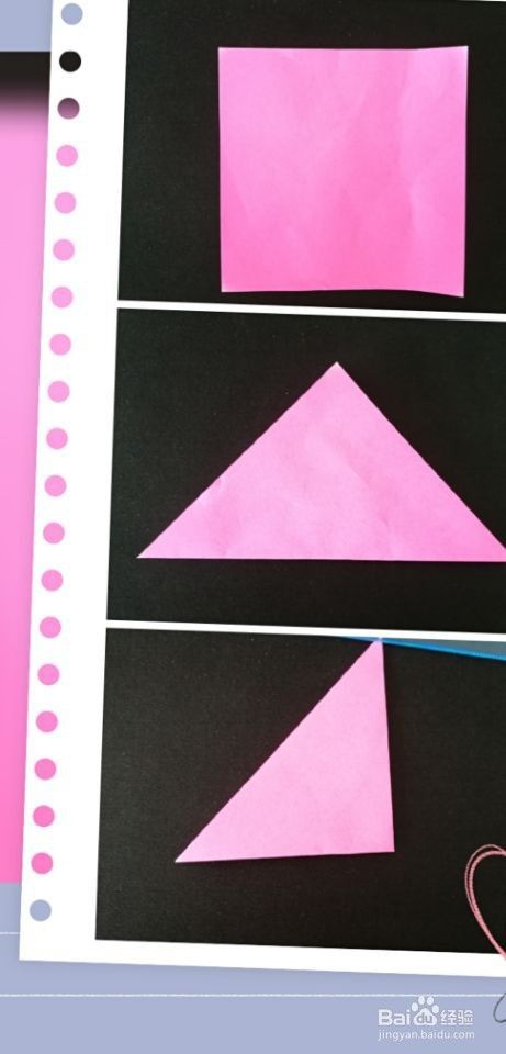 准备一张正方形彩纸,沿对角线折叠成一个大三角形,再次沿中线对折成一个小三角形。