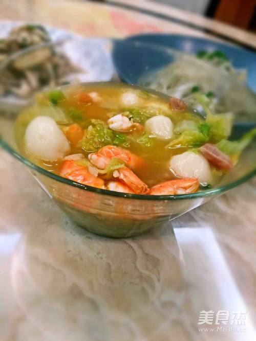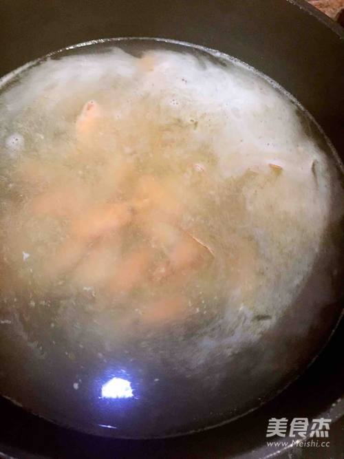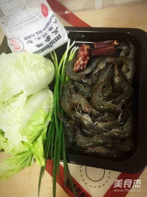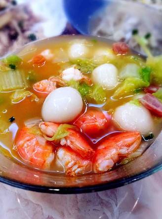 接着把虾和汤圆下锅(糯米粉加温水,揉成面团,再搓成长条,最后分小段揉成汤圆)