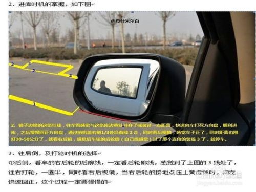 右库为例:右倒库。打火启动汽车,此时汽车在A处应该跟七米线平行,挂倒档,松手刹,轻抬离合使车后移,控制好车速,看左后视镜,当右起点感应线出现在左后视镜,大概位置是左后视镜下沿与感应线垂直距离大概2-3厘米左右)位置时把转向盘右打死。