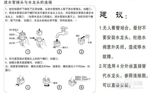 注意:进水过滤器、连接头的将较密封圈应安装良好,拧紧的力量不要太大,以免损害螺纹,供水压力应在30kpa到1000kpa之间,若超过范围,要使用降压或增压装置,安装完毕后,要仔细检查,不要漏水。