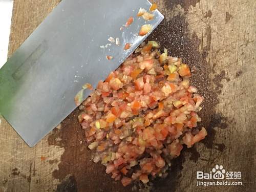 牛肉加点盐,再对半切开西红柿,用勺子先把里面的汁掏出来,放到牛肉上面。不然剁西红柿的时候会溅到哪里都是喔。