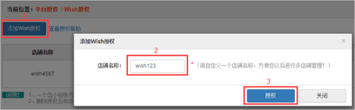 点击【添加wish授权】,任意填写一个店铺名,提交【授权】。