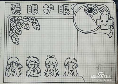 接着在纸的下方画出正在认真做眼保健操的四位小朋友。