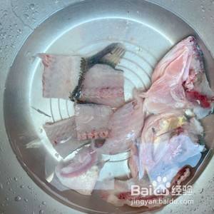 锅内加油,放入鱼骨,将鱼骨煎焦,放入姜片、料酒。