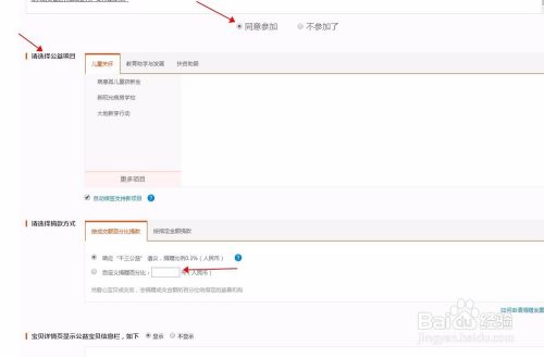 签订支付宝代扣之后,就可以设置公益宝贝了,勾选“同意参加”,选择要参加的公益项目(我是所有项目都选了,店铺产品多,分批选不同的公益项目),还有捐款方式有两个,一个是按百分比,一个是指定金额(我现在的是指定金额)~