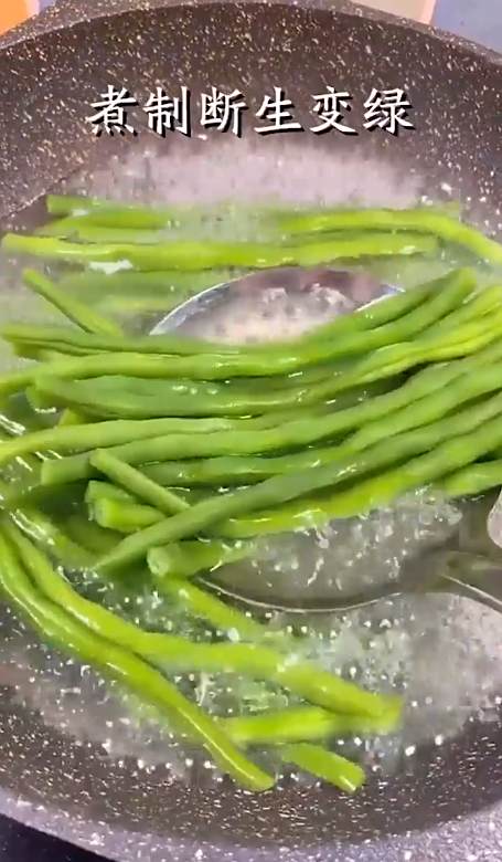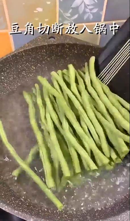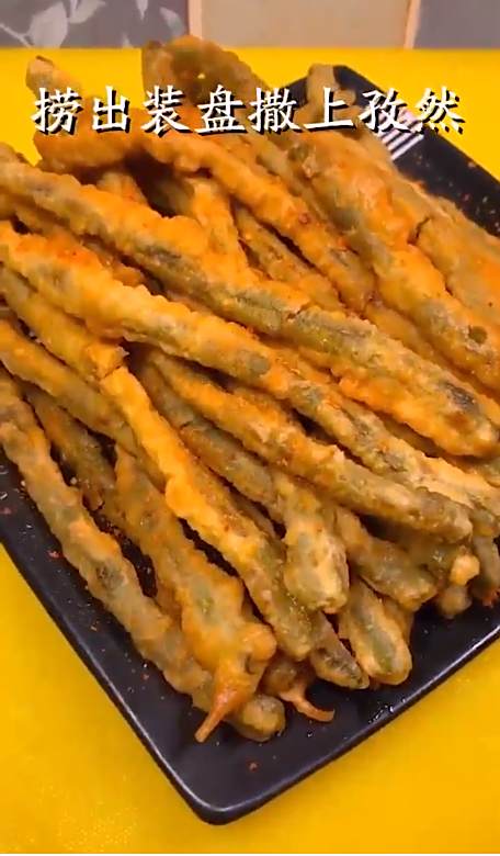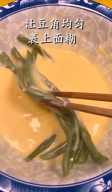 6起锅烧油温六成热下入豆角,炸至金黄捞出。
