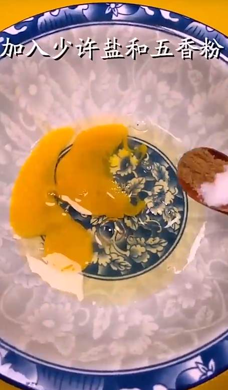 3准备空碗打入两个鸡蛋,少许盐和五香粉。