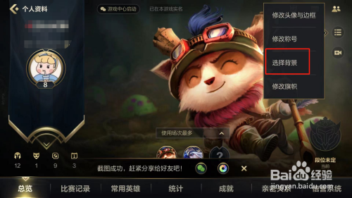 英雄联盟手游修改个人资料背景点击头像进入个人主页,点击功能栏图标,点击选择背景即可修改,具体操作方法如下:
