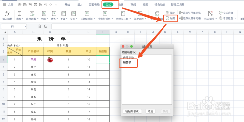 第二步:在公式选项卡中,点击“粘贴”。在粘贴名称弹窗中选择已经定义好的公式名称,点击确定按钮。中如下图所示: