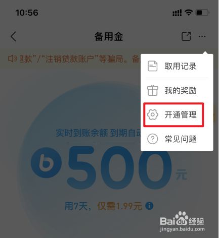进入备用金服务后,点击右上角的图标,选择开通管理的选项,即可关闭支付宝的备用金功能。