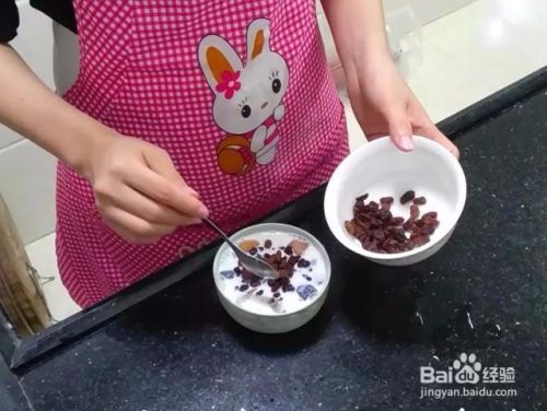 最后倒入一些椰浆 牛奶和炼奶搅拌下,然后再铺上蜜红豆和葡萄干。就这样三色芋圆就做好了,你们学会了吗?