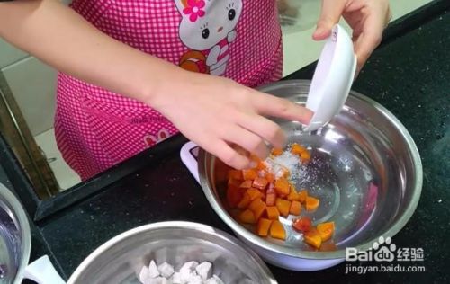 然后加入白糖,芋头倒入10克的白糖,红薯和紫薯分别倒入5克白糖,因为它们本身就带有甜味,所以少加一点就可以了。