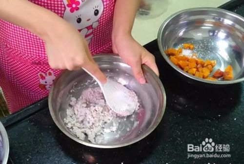 碾压成泥后再分别加入40克木薯粉,如果没有买到木薯粉的,用番薯粉也可以哦。