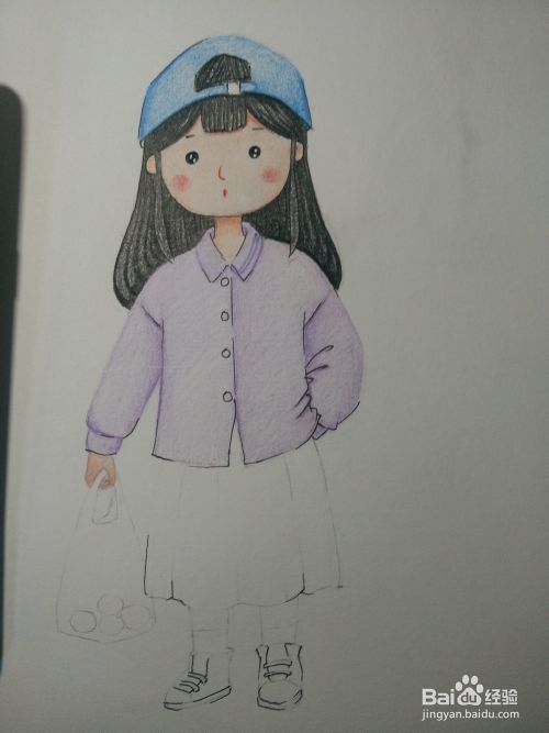 第六步用彩铅浅紫色把小女孩的上半身的衣服涂画出来。