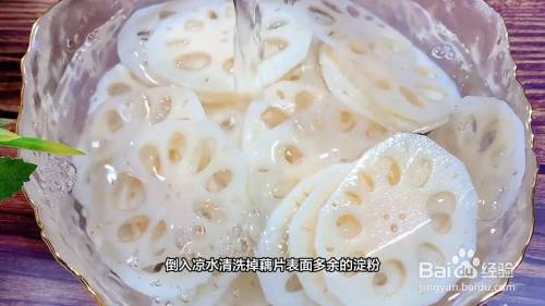 莲藕去皮切成薄片,倒入凉水清洗掉藕片表面多余的淀粉
