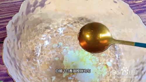 在碗里放入姜蒜末,一勺盐,一勺糖,白醋,一勺香油搅拌均匀倒入藕片