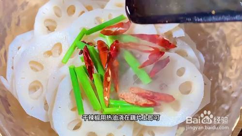 放上葱段与花椒,干辣椒,用热油浇在藕片上即可