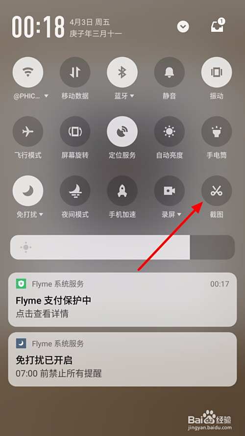 【2】手指屏幕最上方,下拉出通知栏,点击 截图。