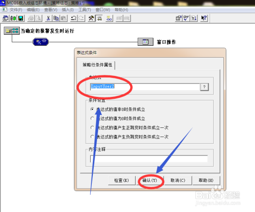 鼠标点击判定条件图标,在表达式条件窗口中表达式并点击确定,报警策略就创建完成了。
