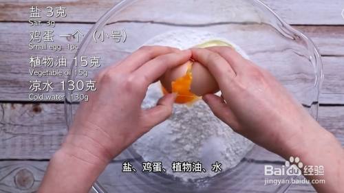 在碗里加入中筋面粉、小苏打、泡打粉、盐、鸡蛋、植物油、水,然后用筷子搅成团,接着盖上盖子醒面半个小时。