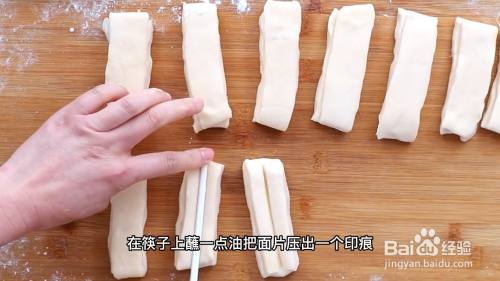 接着用刀将面团切成面片然后再对半切开,在筷子上蘸一点油把面片压出一个硬痕。油温烧热后下入油条炸。