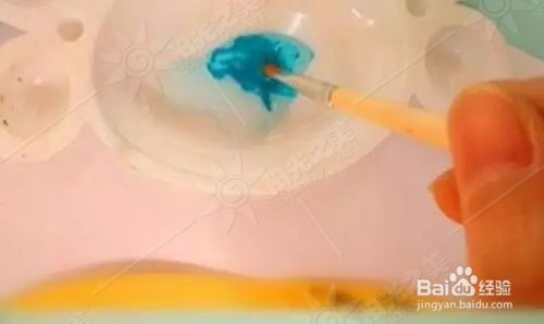用白乳胶将小鱼固定在白色卡纸上。用水调和水粉颜料,为小鱼画个漂亮的大海吧!