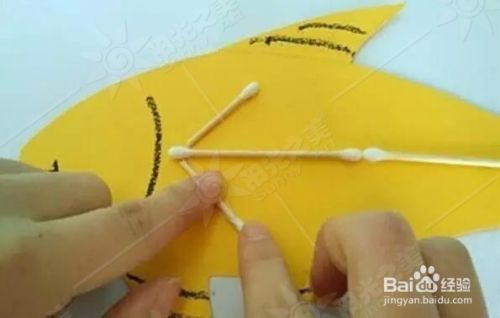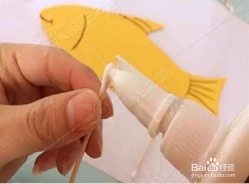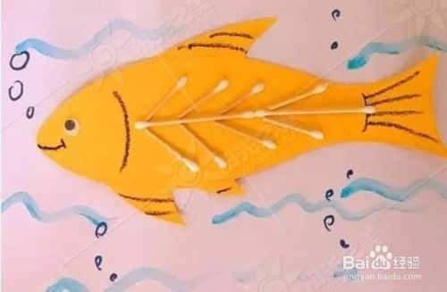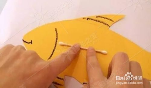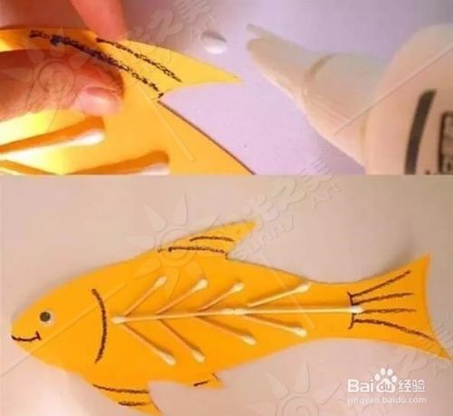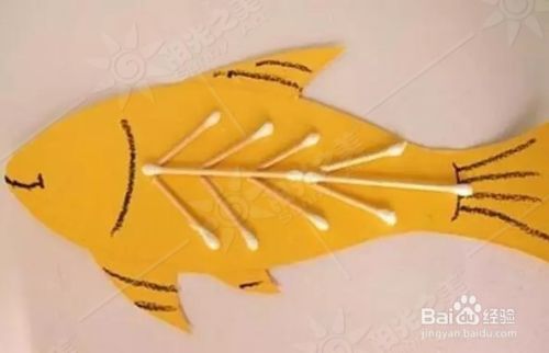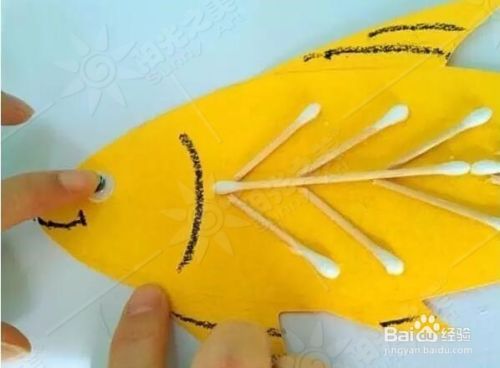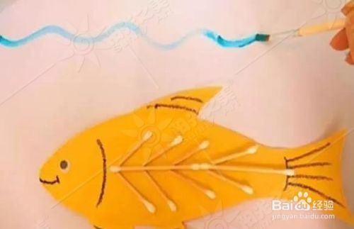 给小鱼添画上漂亮的花纹。你想画成什么样的呢?发挥你的想象力吧!将棉签变成小鱼的骨头。