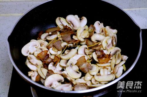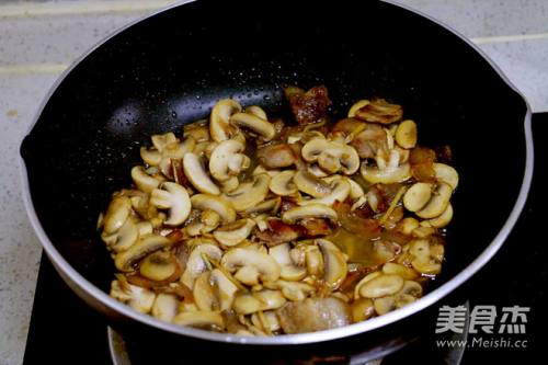 5接着放口蘑,调入生抽,改大火翻炒,淋入一点点清水,不要多
