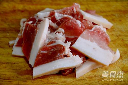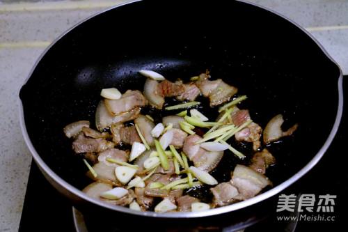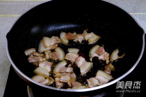 3热锅热油,油要少。先下五花肉小火煸炒出肥油,五花肉要煸炒的微微卷起来才好吃