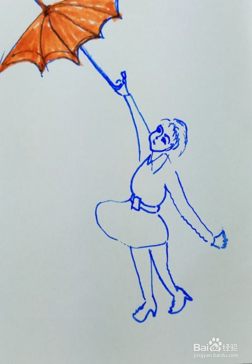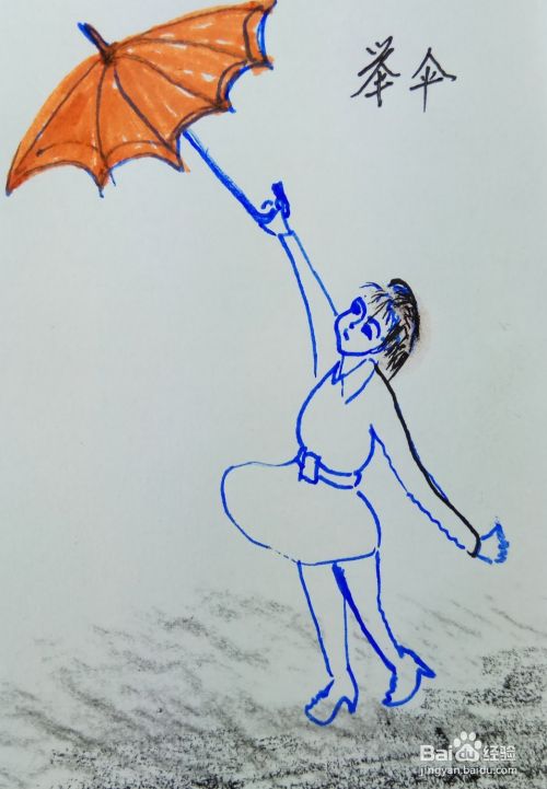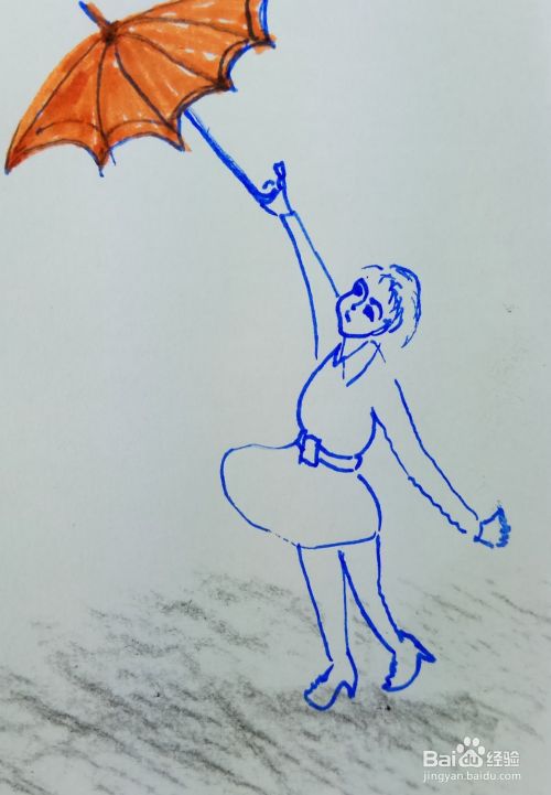 画出她右手里拿着的一把雨伞的外形轮廓,并涂出雨伞的色彩。