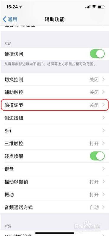 最后是辅助功能里的 “触摸调节”(iOS 13 改为“触控调节”),如图: