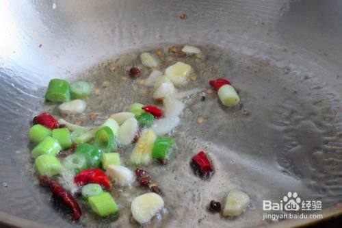 将葱姜蒜和干辣椒一起放入锅中爆香。