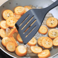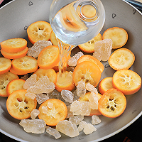 平底锅中倒入金桔片、冰糖和50毫升清水,开中火。