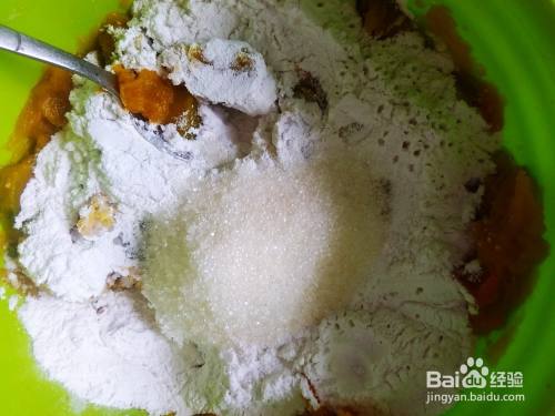 下300克的糯米粉和适量的白糖进去,搅拌至没有颗粒为止。