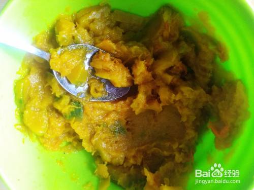 然后拿出来放到盘中,用勺子压成瓜泥。