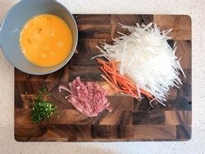 鸡蛋两个打散,萝卜切丝,瘦肉切丝,红萝卜是为了做出来颜色好看,可有可无。(瘦肉可以用火腿肠切丝代替)