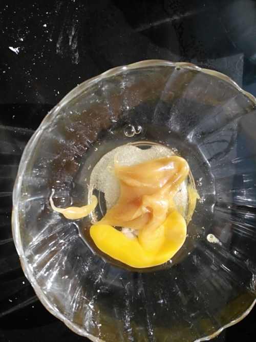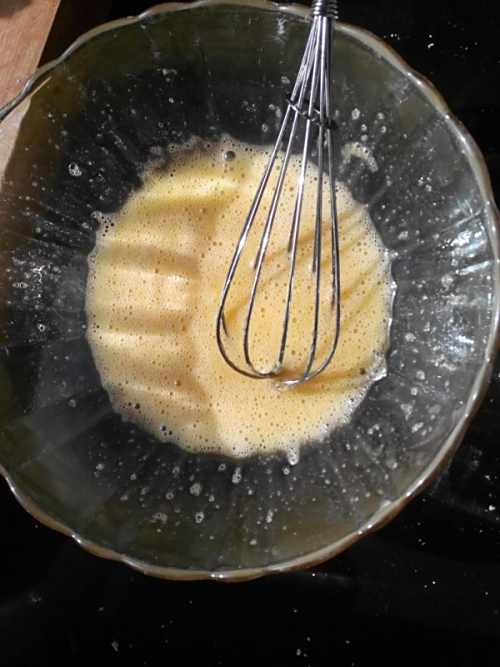 3鸡蛋打入碗内加一大勺蜂蜜,在加15g白糖搅拌均匀。