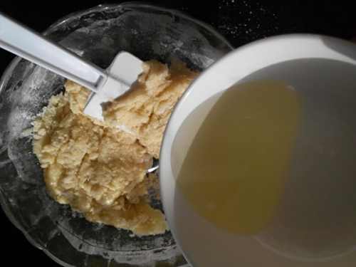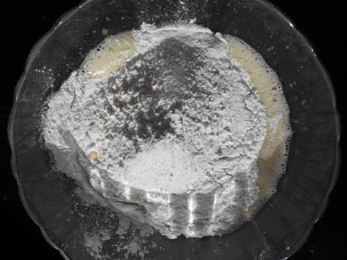 5把筛好的粉类倒进碗内用刮刀拌匀。