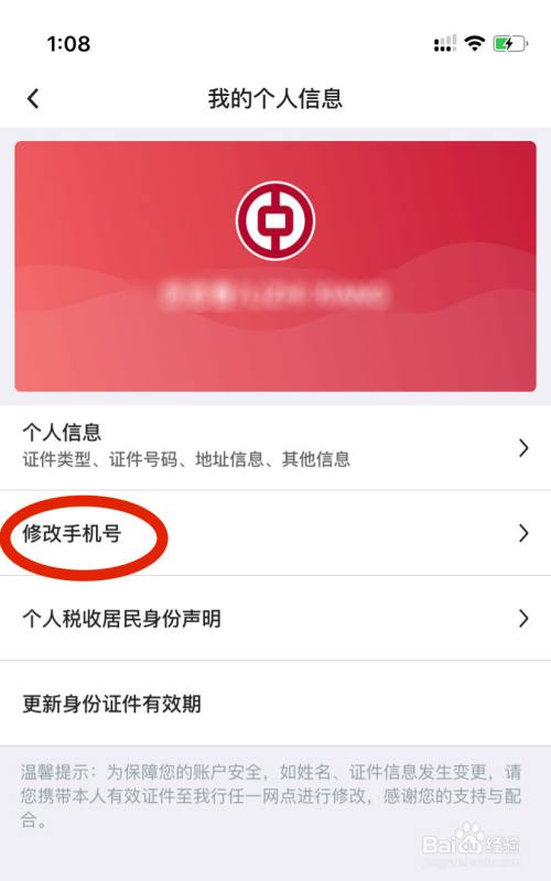 在中国银行我的个人信息页面中,点击“修改手机号”。