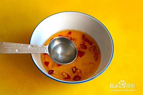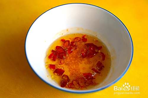 将红干椒剪碎放在碗里,放入食盐,然后再浇入1大勺烧热的食用油搅匀。