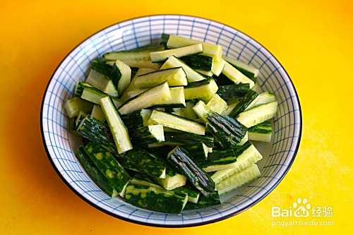 将黄瓜洗干净后,用刮丝器将瓜皮刮一刮,然后切成粗条状。