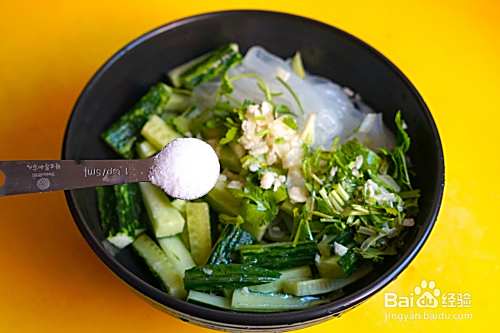 将凉皮、黄瓜、香菜、蒜蓉都放入一个大碗中,加入盐颠一颠,筛均匀后腌制2分钟。
