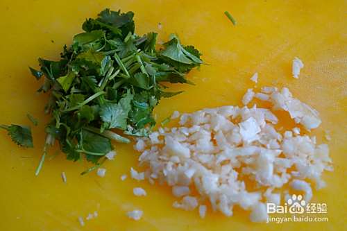 将香菜洗干净,蒜头拍一拍去皮,再把两种调味食材都切碎。