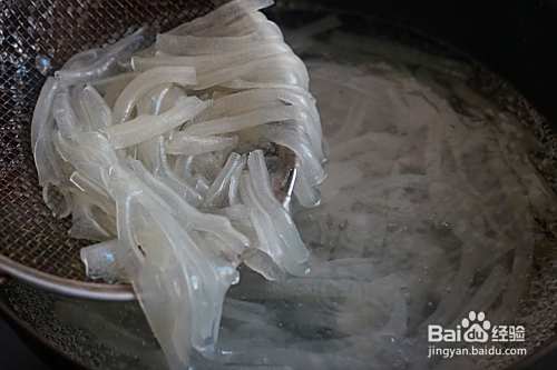 将凉皮焯水后捞出来在凉开水里过一遍。