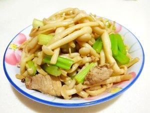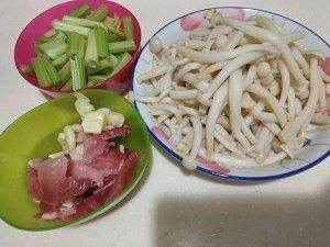 白玉菇控干净水装盘待用,芹菜一根切段待用,猪腿肉切片。