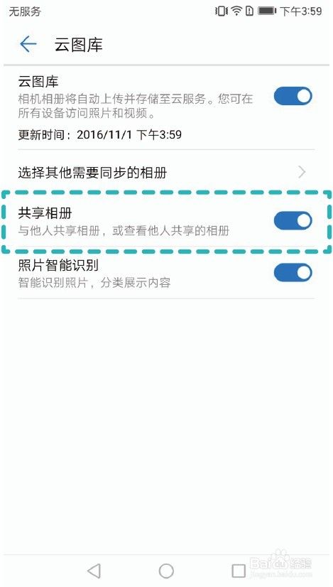 在图库界面点击【更多】>【设置】>【云图库】,打开【共享相册】开关。