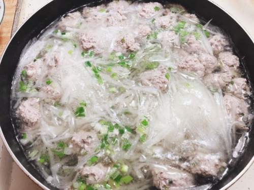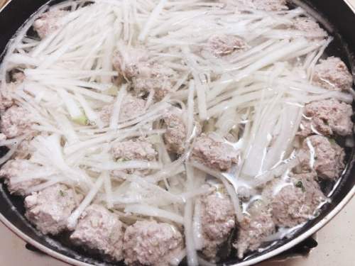 5大火加水烧开,下萝卜丝,加几个姜片,煮至透明,换小火,在水不沸腾的状态下,用虎口挤出,下肉丸( 新手想要美观的话,可以提前用手揉成肉丸;自己吃不在乎形状的话,可以直接用勺子 )