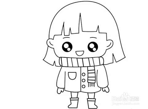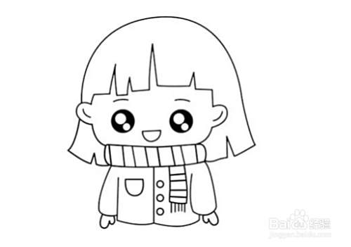 在围巾下面继续画出小女孩的上衣,上面有圆圆的纽扣和大大的口袋