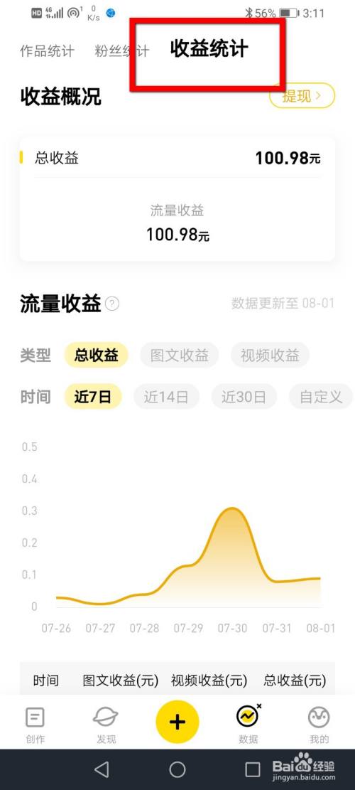 在数据里面点击收益统计下方的提现。