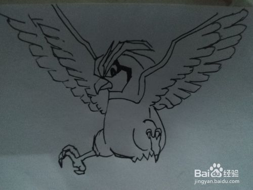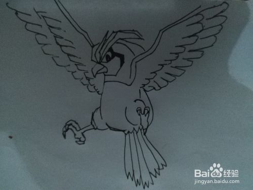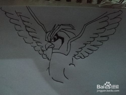 接着画上身体整体轮廓,画上一对大翅膀,翅膀呈现展开,底下由一片片羽毛组成,画的时候需要耐心;